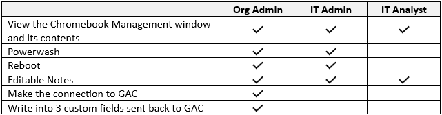To add it, go to Policy Management > Feature Settings > Connectors. Click Manage Connector, enter the Admin email, and then click Connect. - The user must have Reboot and Powerwash permission. See table below for the current permission settings.