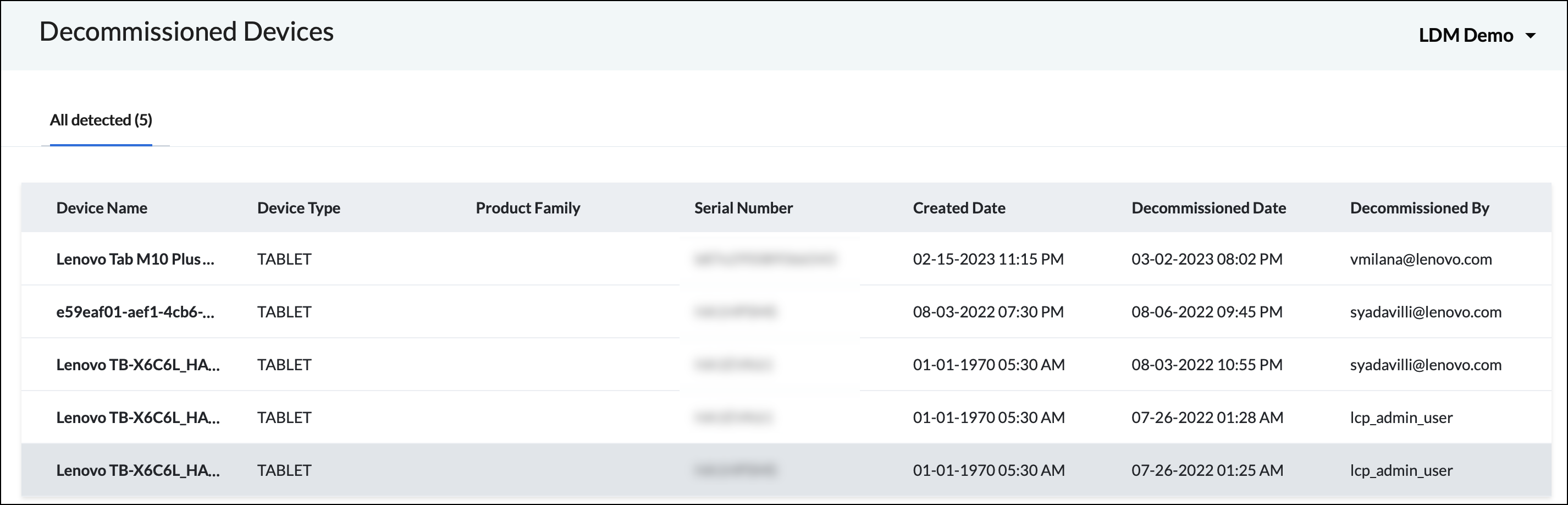 To maintain these records, LDM automatically adds this device to the Decommissioned Devices report. Users can filter the data by date range, search for specific devices, and export the report. The Decommissioned Devices report contains the following information: