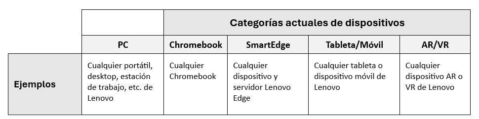 Los dispositivos representan los distintos tipos de dispositivos que hay en su organización y que suelen utilizar los empleados. Un tipo de dispositivo puede pertenecer a cualquiera de las siguientes categorías: