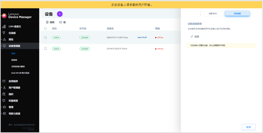 注:设备必须联机、获得许可并装有 Intel vPro 代理。设备必须有人照管,因为最终用户必须同意与 LDM 用户共享访问权限。