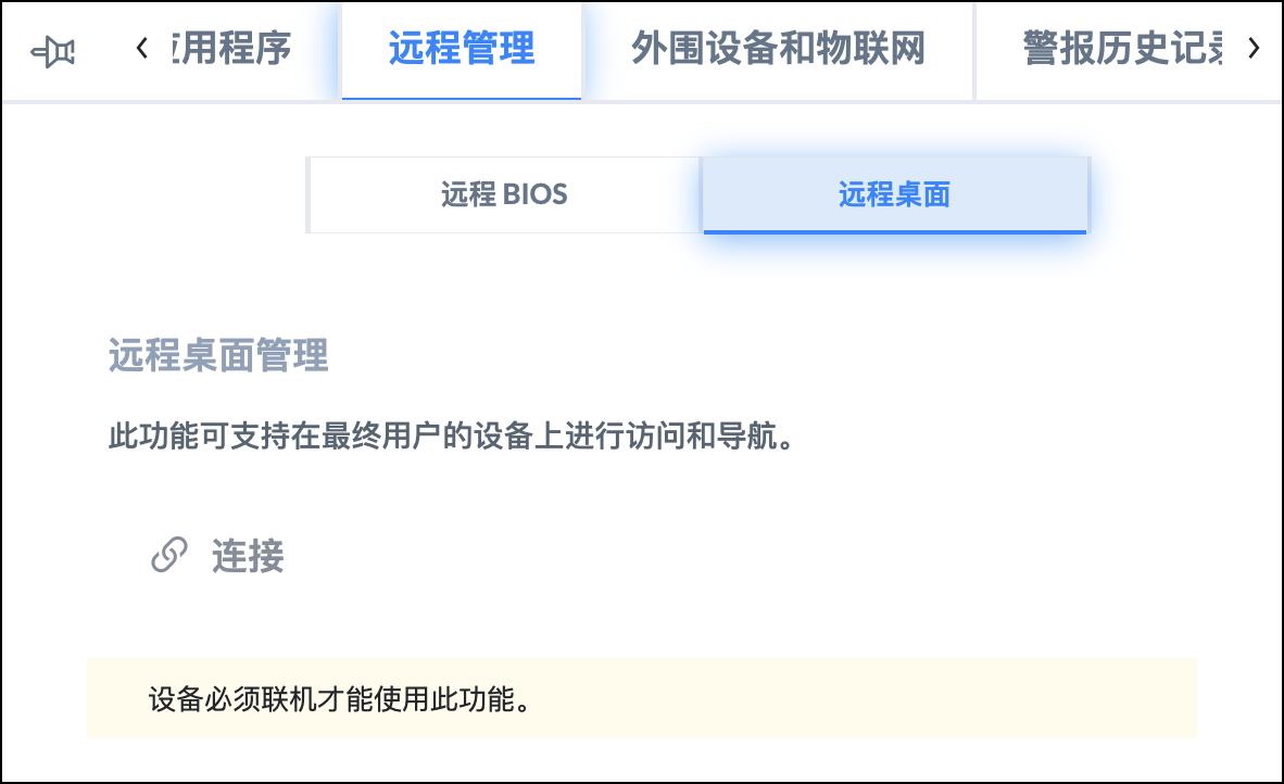 IT 管理员可以通过设备管理 > 设备页面、选择设备托盘中的远程管理选项卡并接着选择远程桌面来连接到符合条件的最终用户设备。